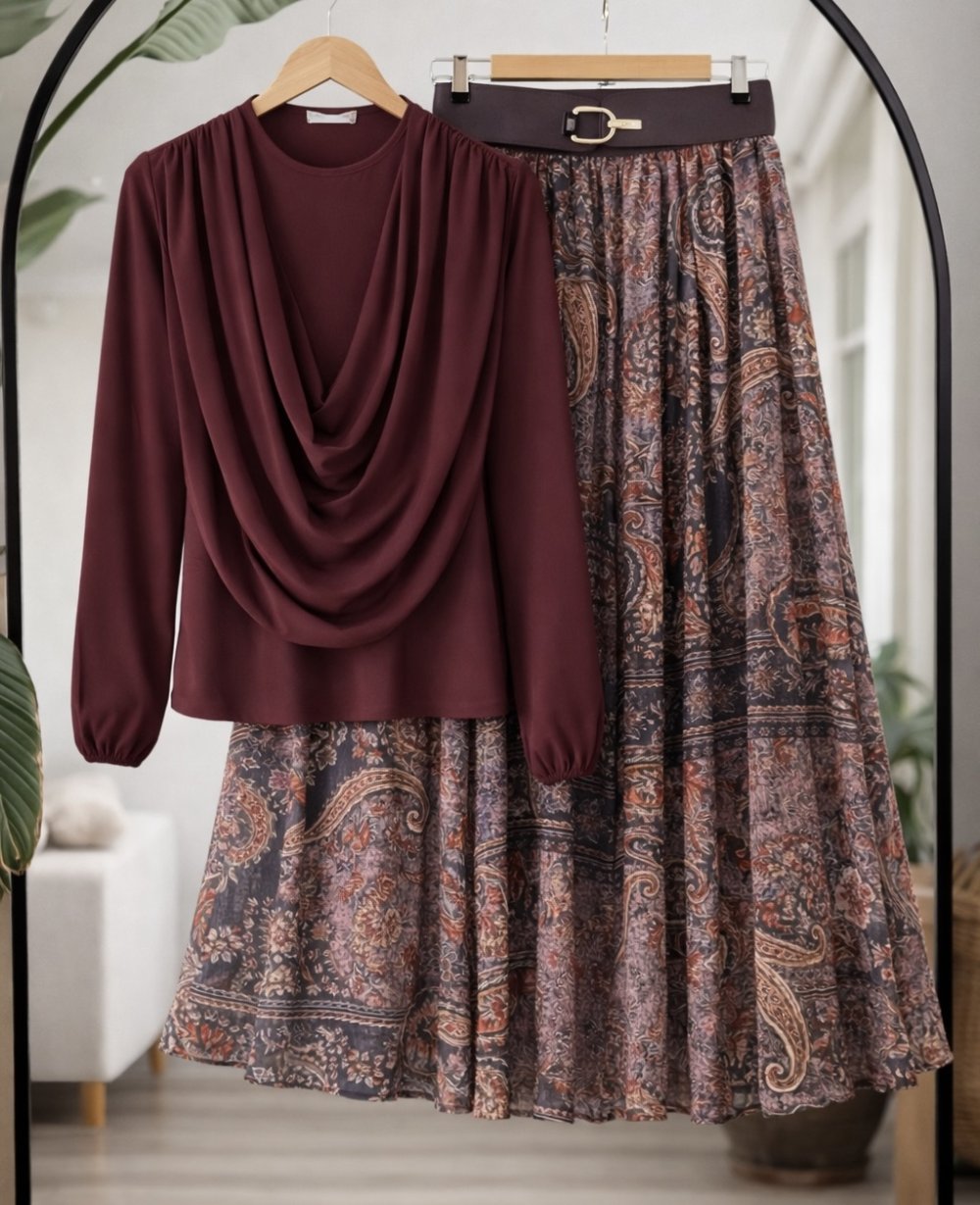 Astarlı şifon Etek Blüz Takım Bordo HT8082