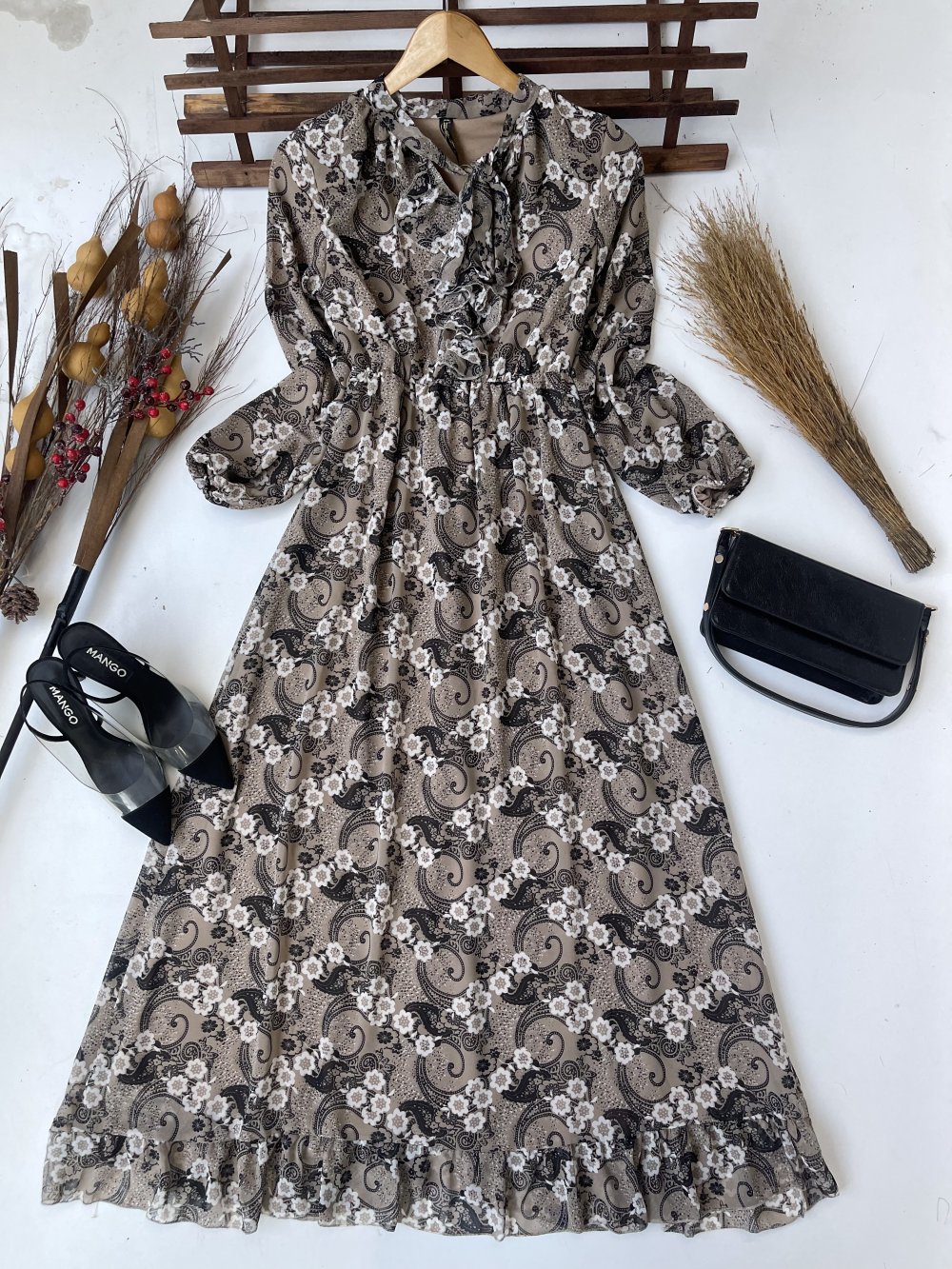 Astarlı yaka fiyonklu şifon elbise Bej HBS1619