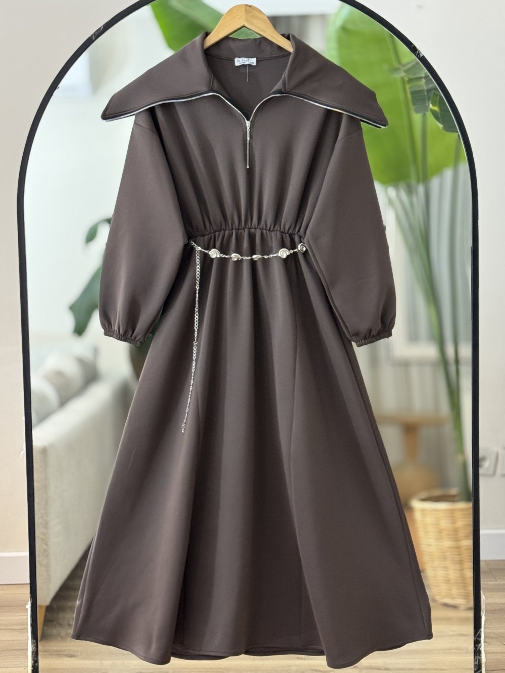 Ayarlanabilir fermuarlı Yaka bel lastikli elbise Kahverengi BK9526