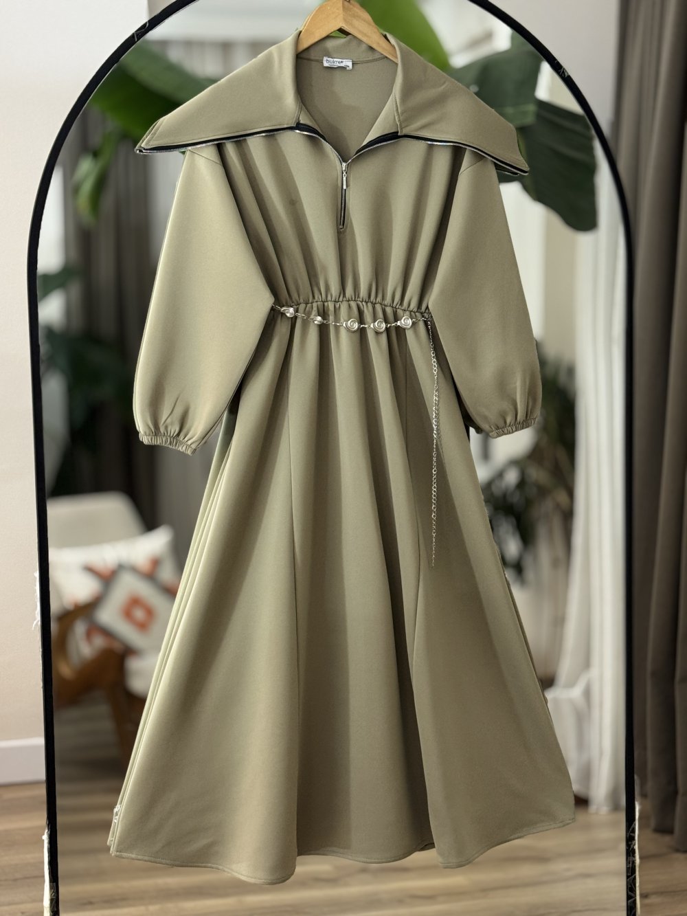 Ayarlanabilir fermuarlı Yaka bel lastikli elbise Yeşil BK9526