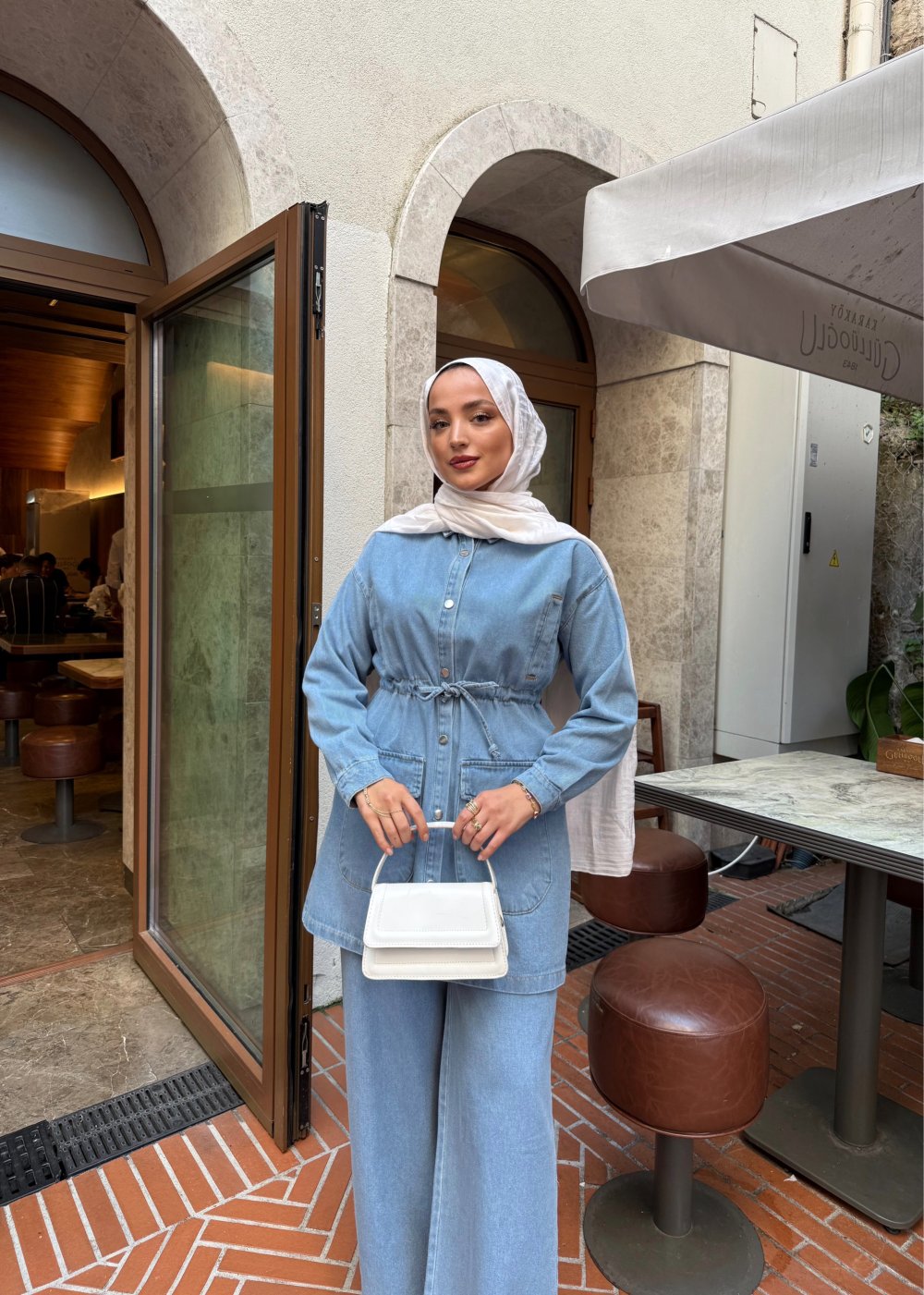 Bel bağcıklı cepli Kot takım Mavi YRN30542