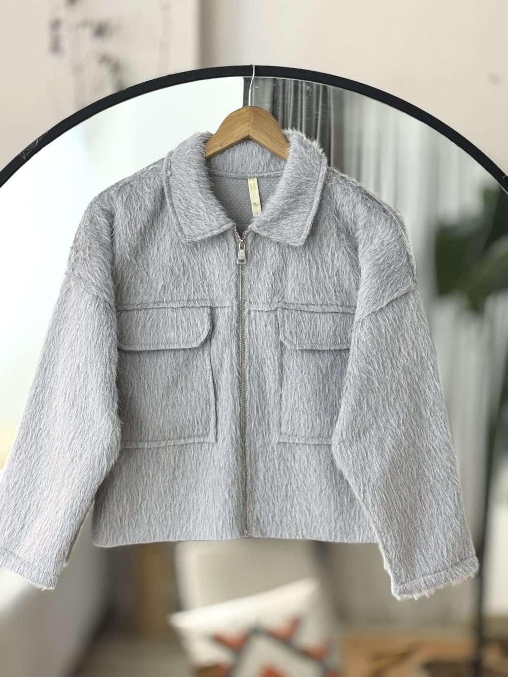 Cepli fermuarlı Pelüş Kısa ceket Gri TB8030