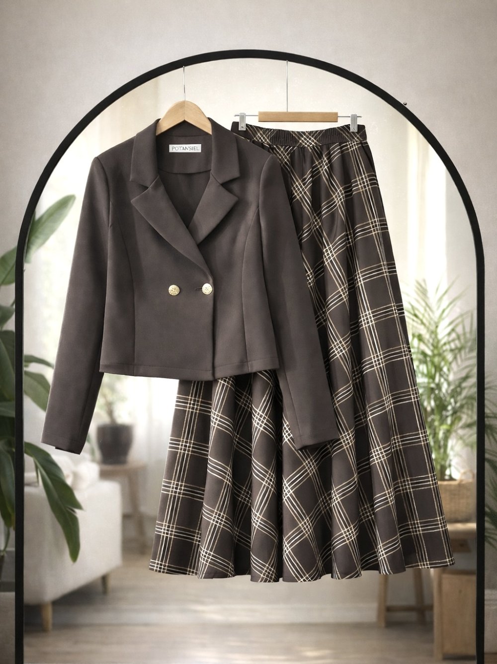 Çift Düğmeli Ekose Etek Ceket Takım Kahve UMS50336