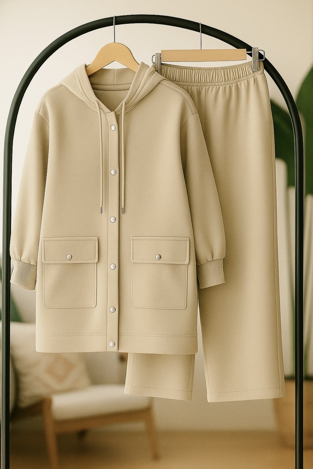 Çır çıt Düğmeli Kapşonlu İkili Takım Bej TCN40131
