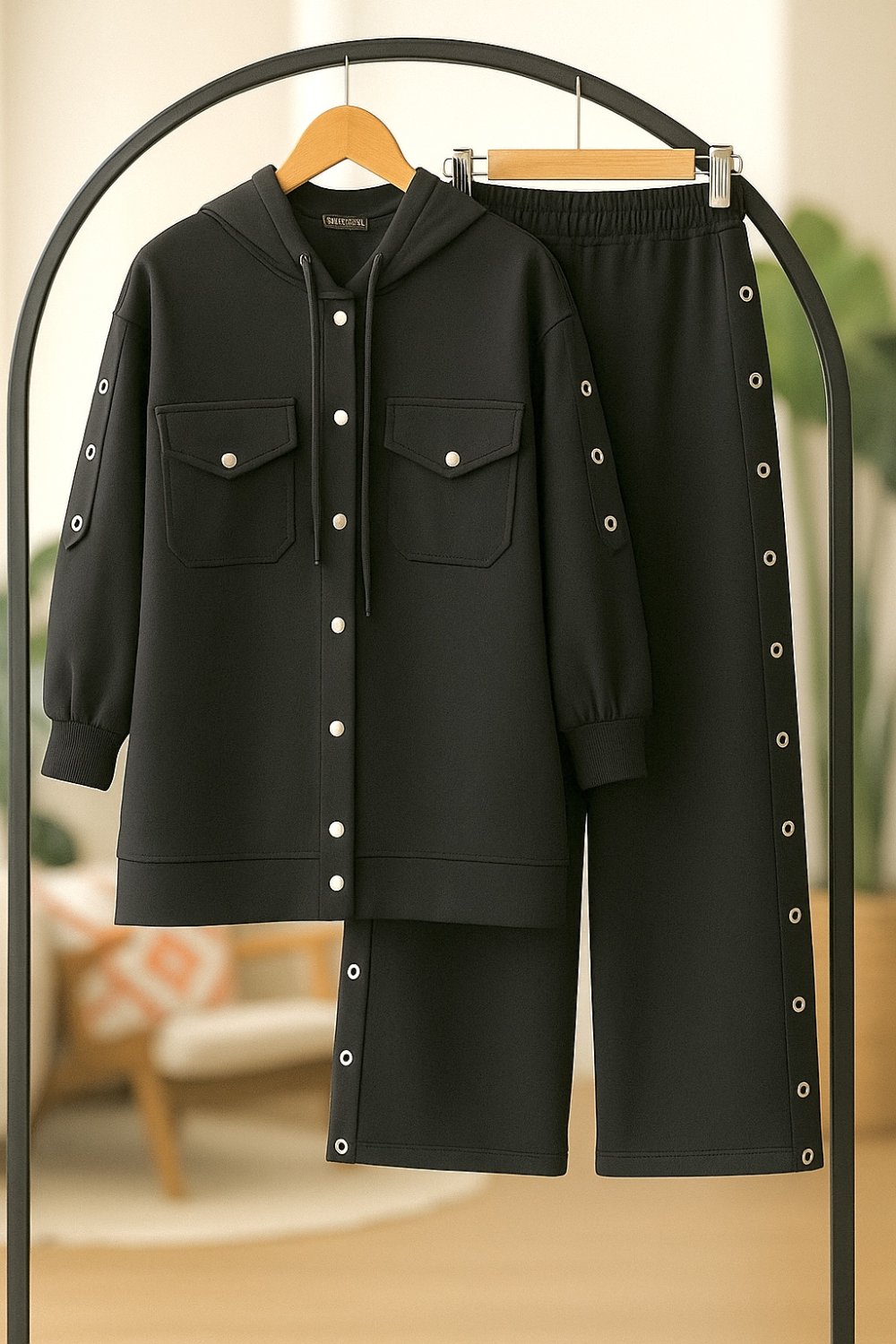 Çıt Çıt Düğmeli Kuşgözü şerit İki Takım Siyah TCN40130
