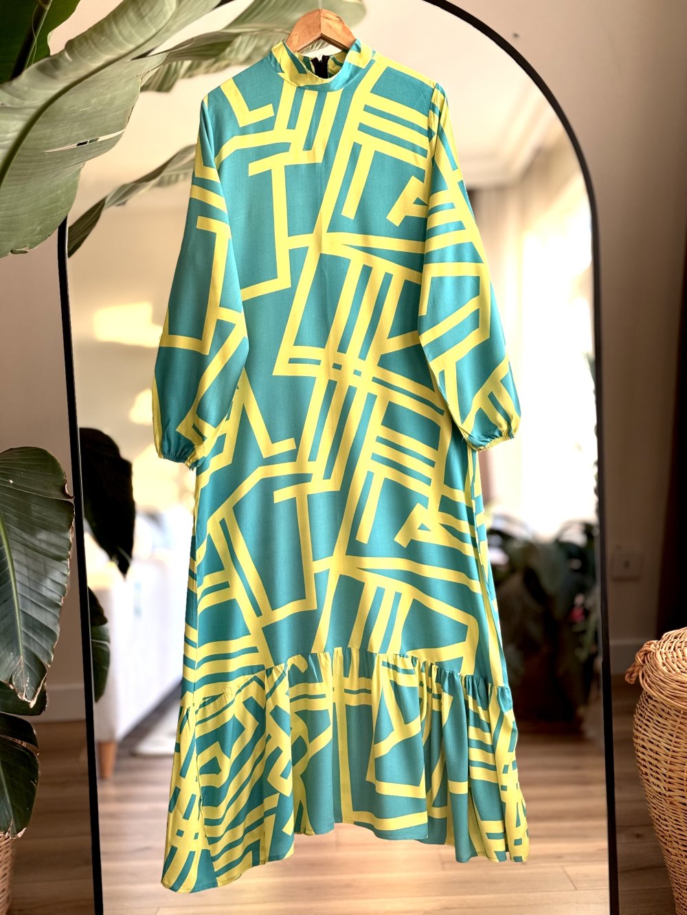 çizgi Desen Kuşaklı Viskon Elbise Yağyeşil SLT30317