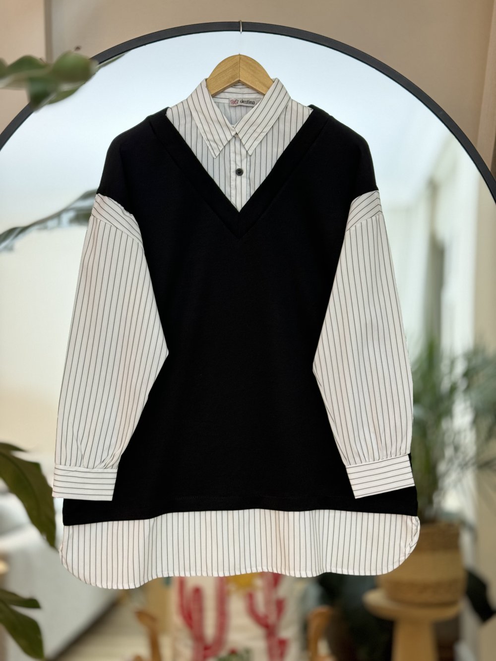 Bu ürün: Çizgili gömlek Detaylı iki iplik Tunik Siyah DST30304
