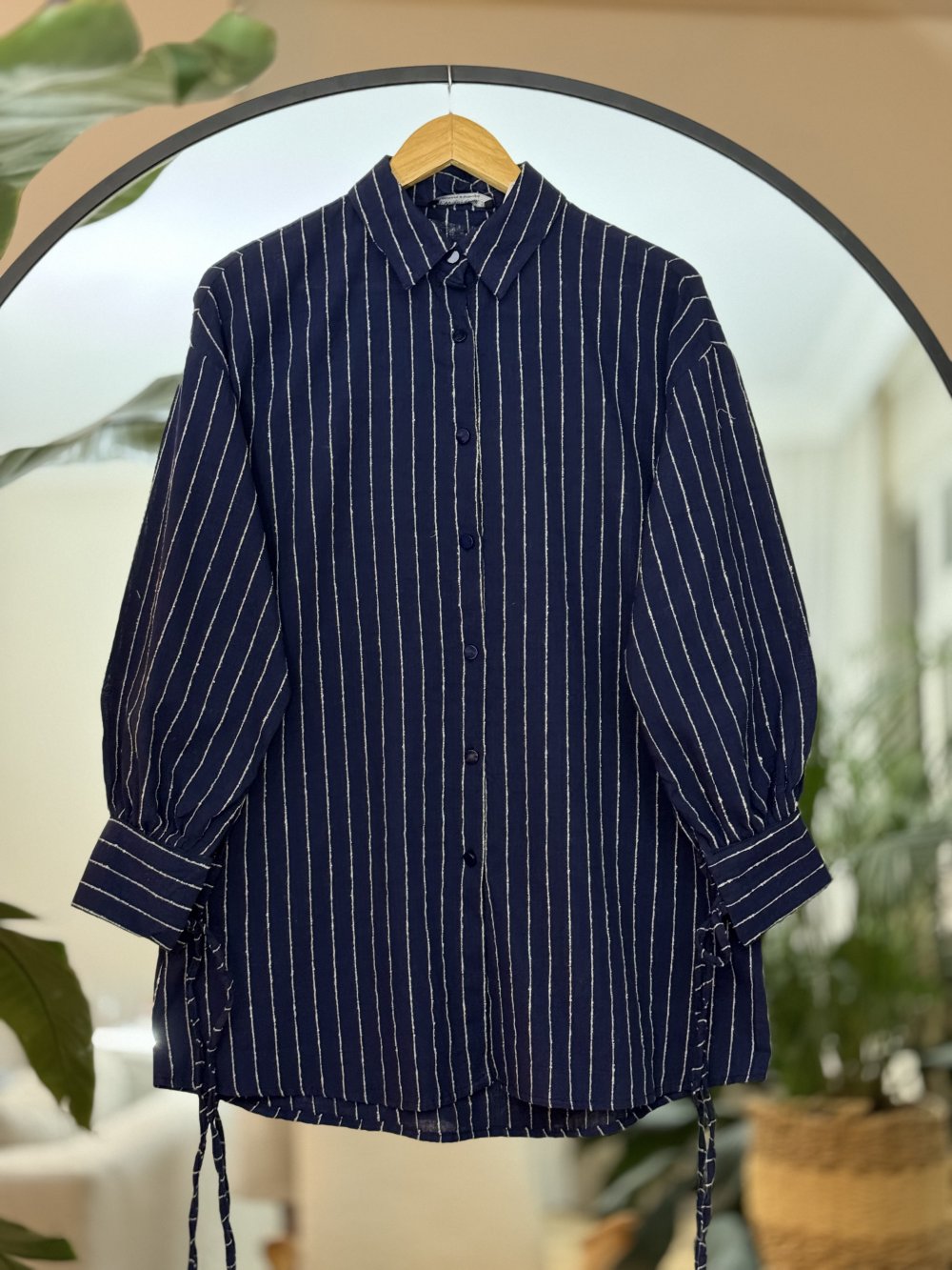 Bu ürün: Çizgili Kol bağcıklı Keten Tunik Gömlek Lacivert NEW30301