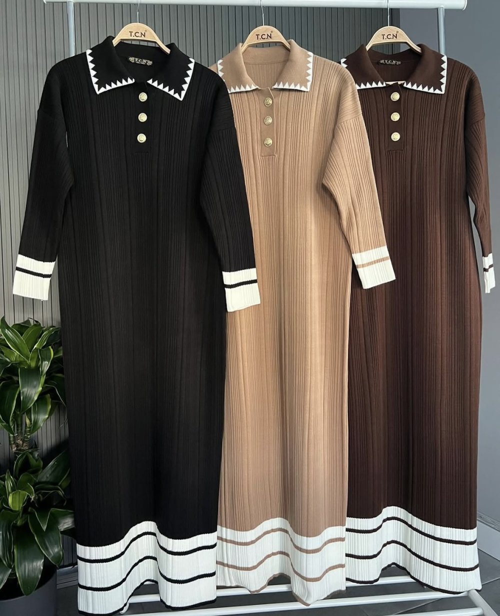 Çizgili yaka Düğmeli Triko Elbise siyah TCN4082