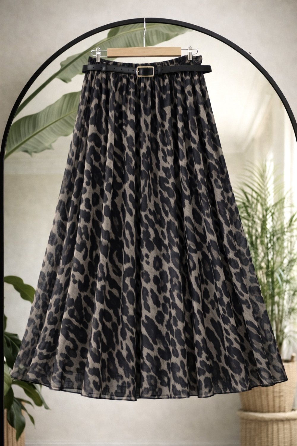 Deri kemerli astarlı şifon etek siyah leopar UMS50343