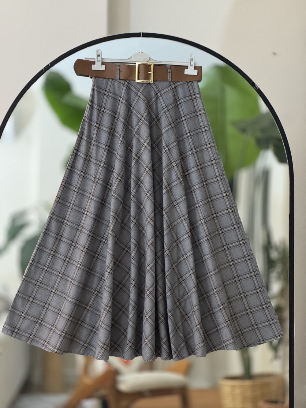 Deri kemerli Yandan fermuarlı ekose Kiloş Etek Gri BK9532