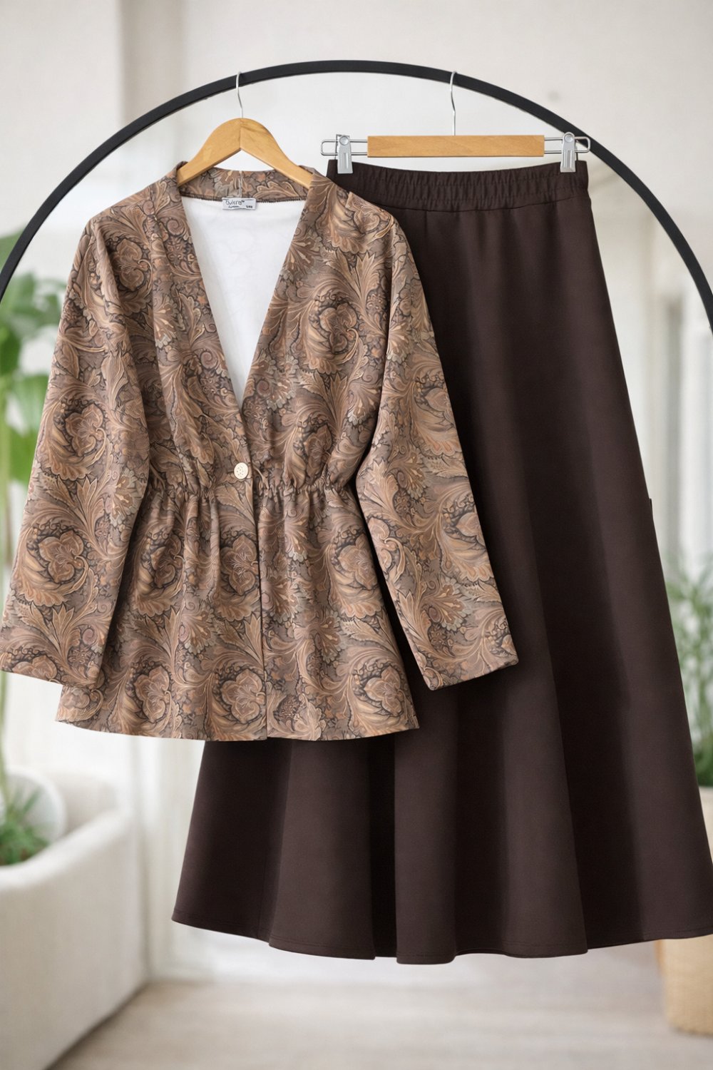 Desenli ceket Kiloş Etek Takım Kahve BK9538