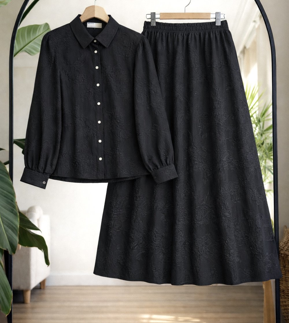 Desenli jakarlı etek gömlek takım Siyah UMS50346