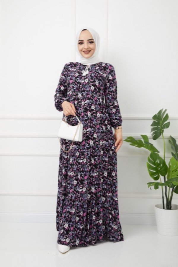 Desenli Viskon Kumaş Elbise Siyah HBS1150