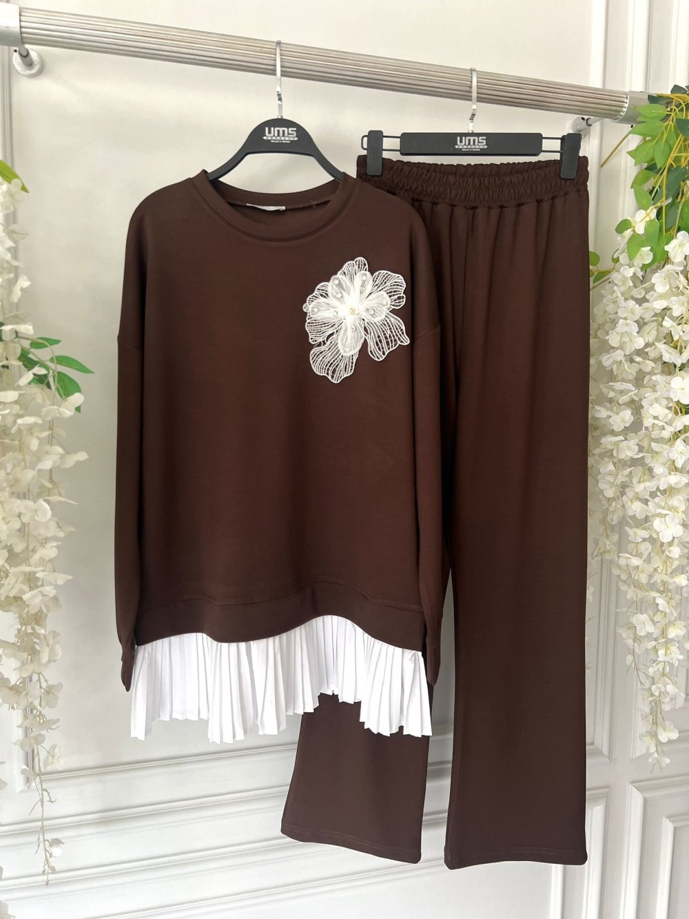 Etek ucu Piliseli Gül detaylı Takım kahve UMS50319