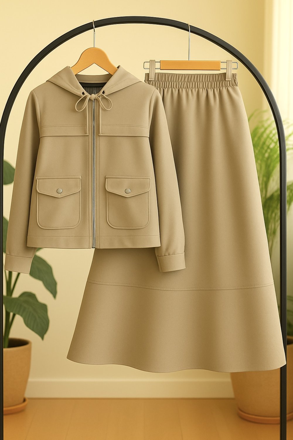Fermuarlı oval cepli kapşonlu ettekli takım Vizon TCN40133
