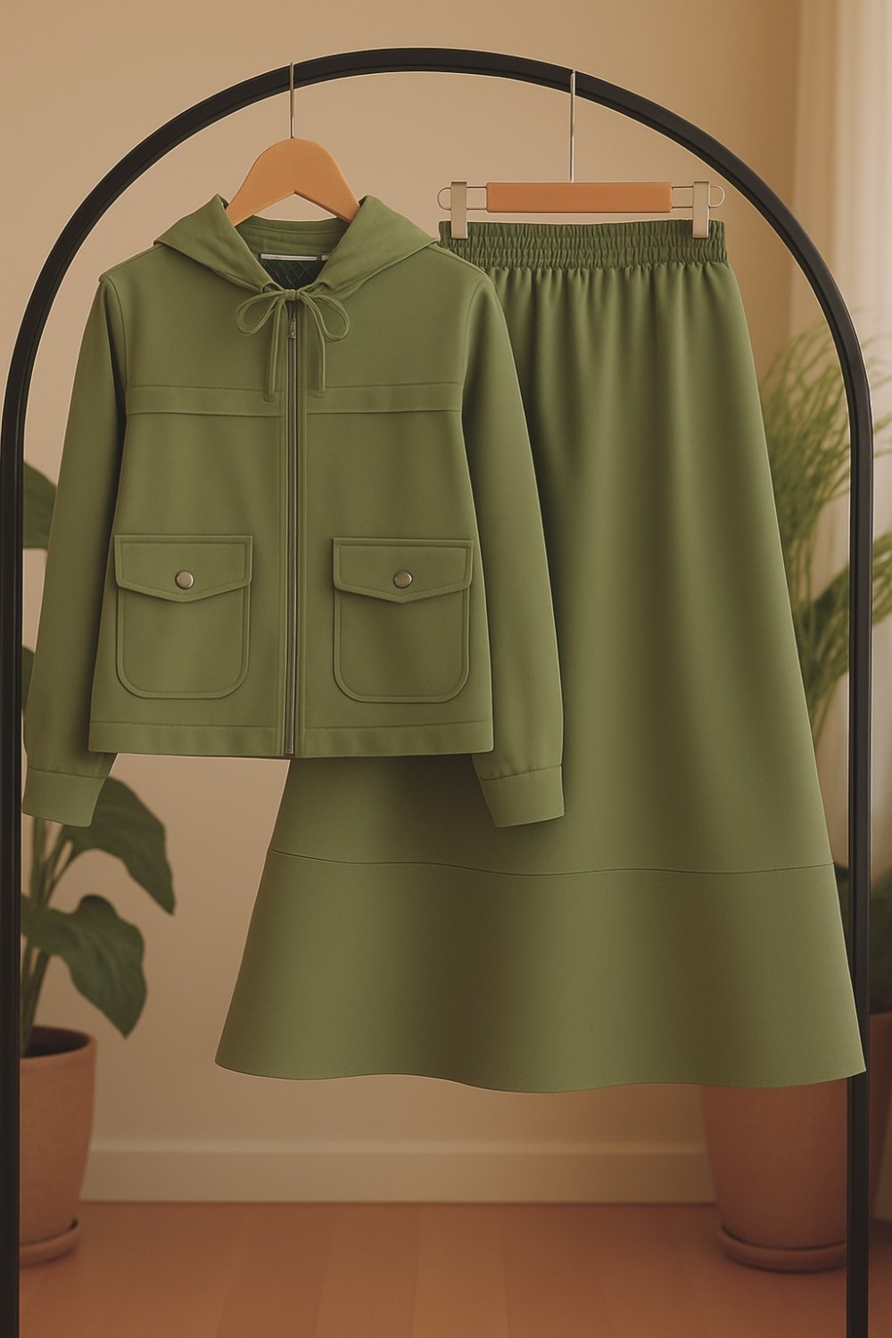 Fermuarlı oval cepli kapşonlu ettekli takım Yeşil TCN40133