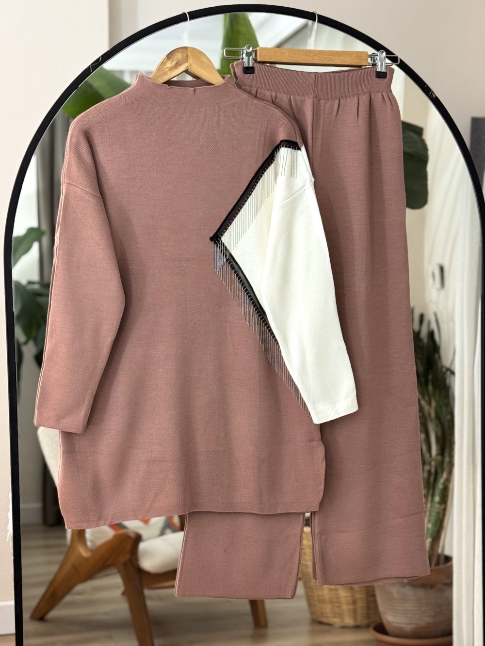 İki renk zincir detaylı triko takım gül SLT30181