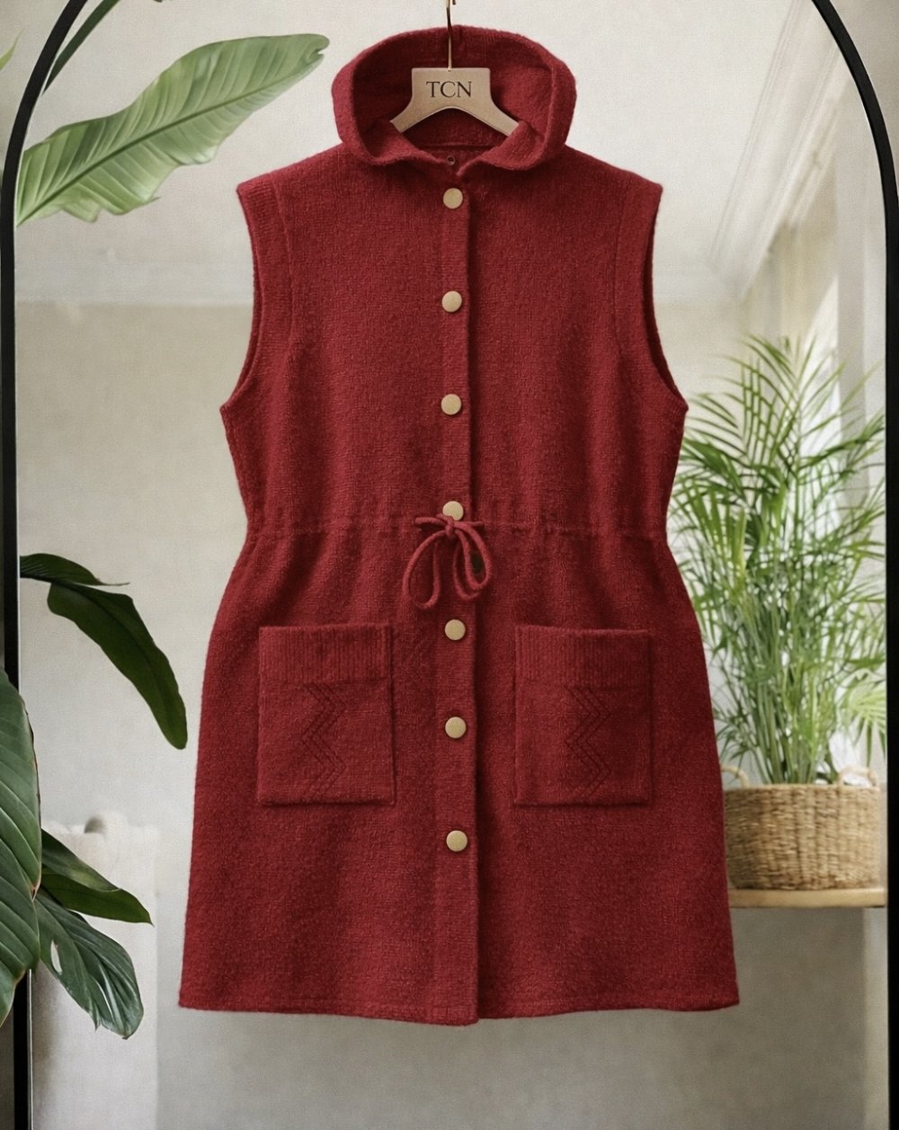 Kapşonlu belden bağcıklı triko yelek Bordo TCN40153