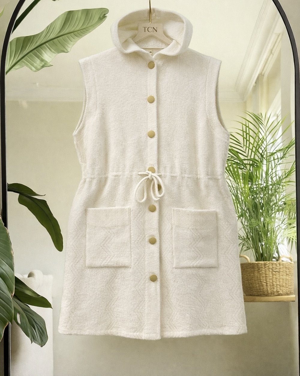 Kapşonlu belden bağcıklı triko yelek Ekru TCN40153