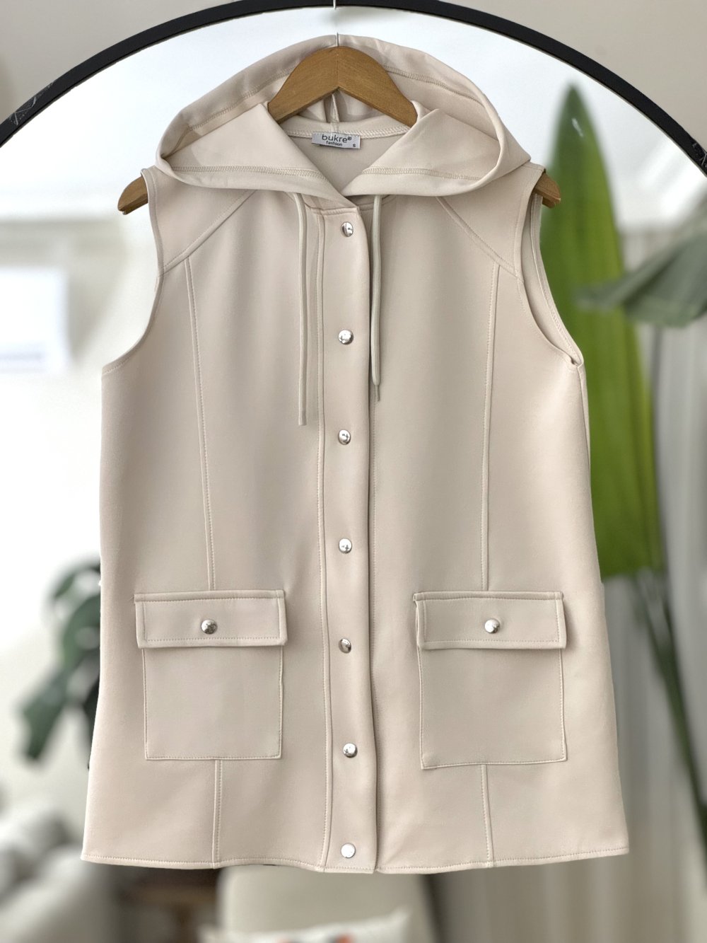 Kapşonlu cepli citcitli Yelek Bej BK9519