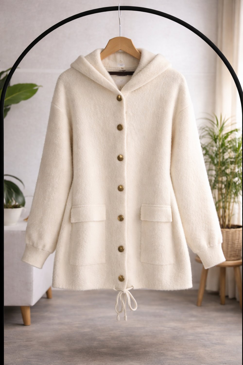 Kapşonlu metal düğmeli Sakallı Hırka Ekru TCN40150