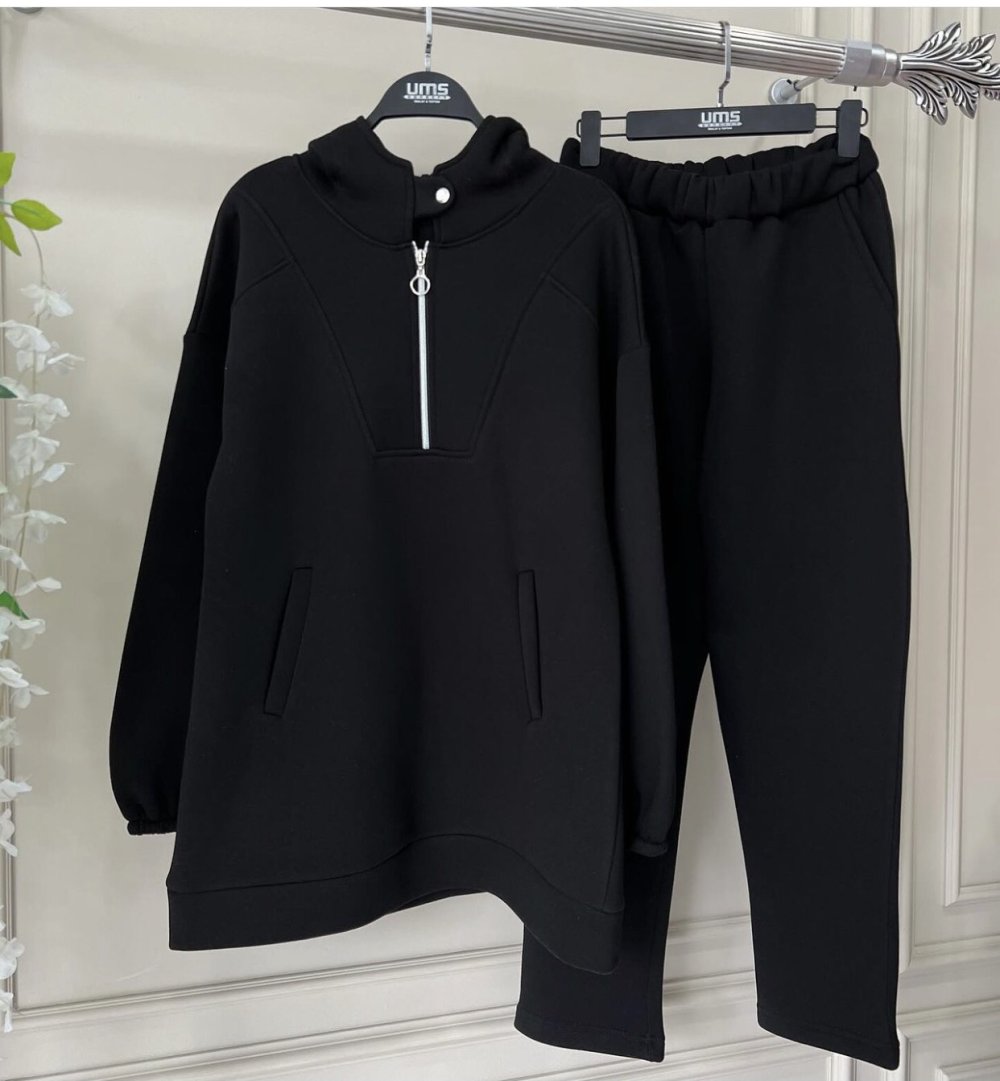 Kapşonlu Yaka fermuarlı Üçiplik Takım Siyah UMS50119