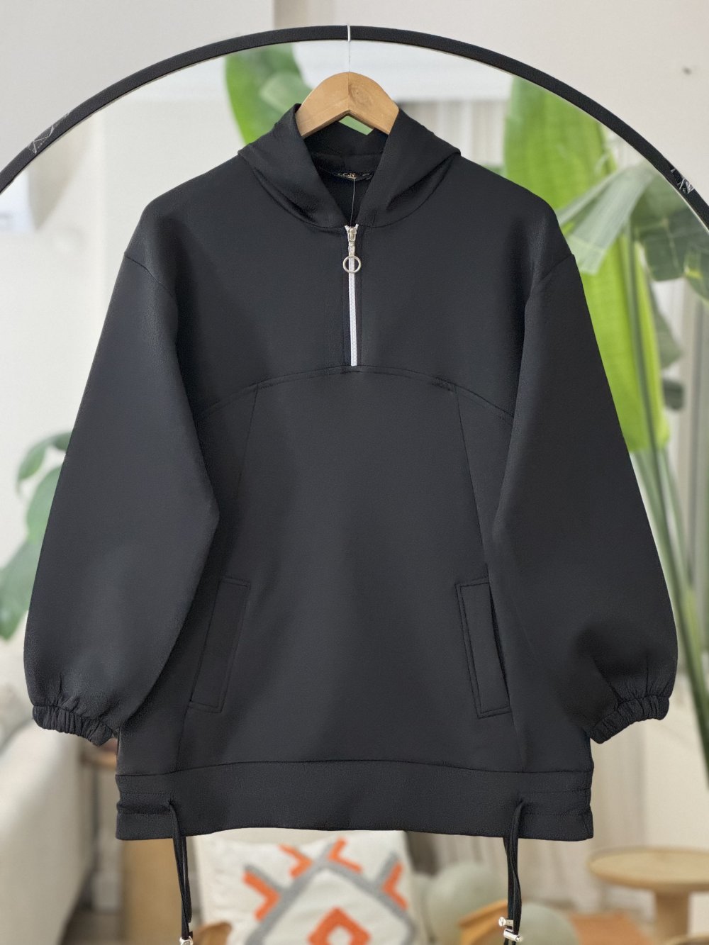 Kapşonlu Yarım fermuarlı ipli Tunik Siyah TCN40120