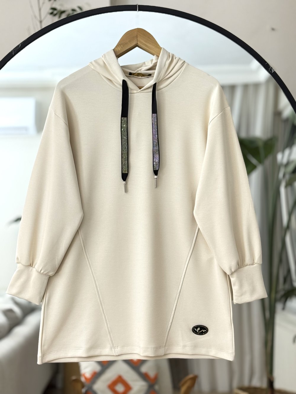 Kapüşonlu armalı oyso tunik bej TCN40108