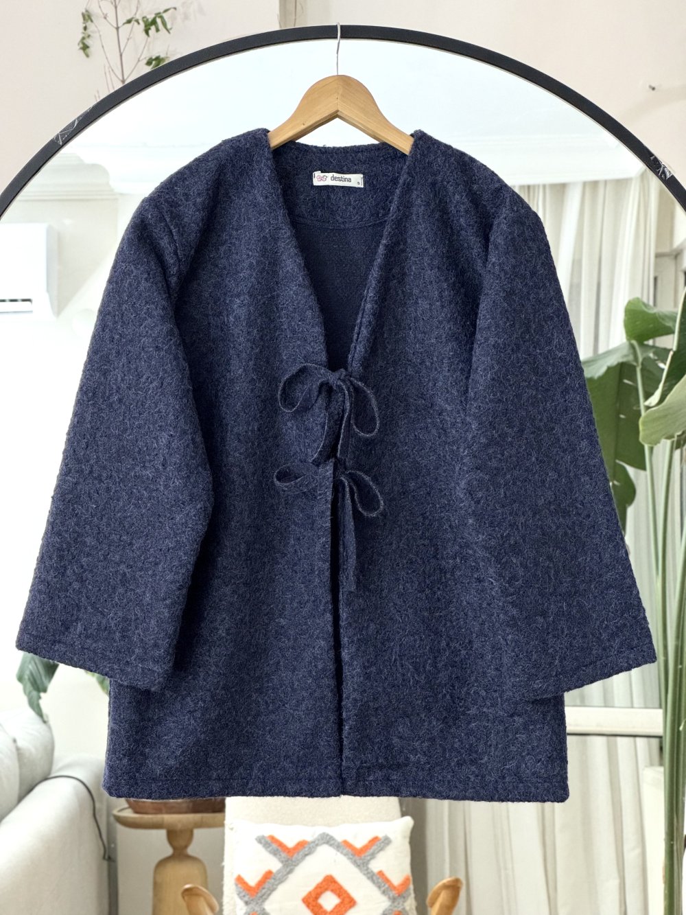 Kaşe Kumaş fiyonk Bağlamalı Hırka Lacivert DS2052