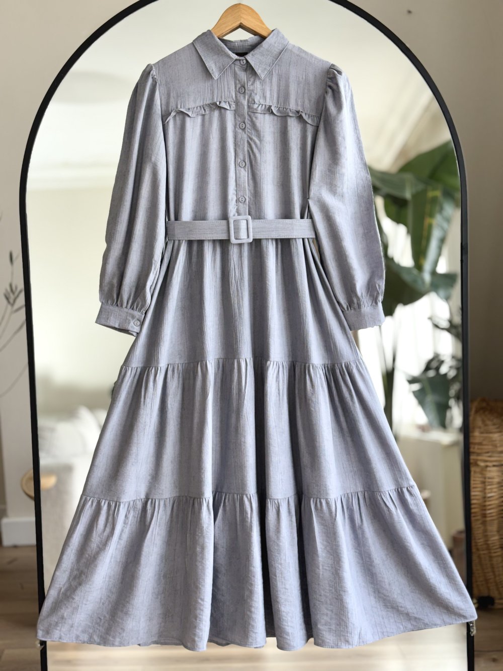 Kemerli fırfır Detaylı elbise Gri UMS50241