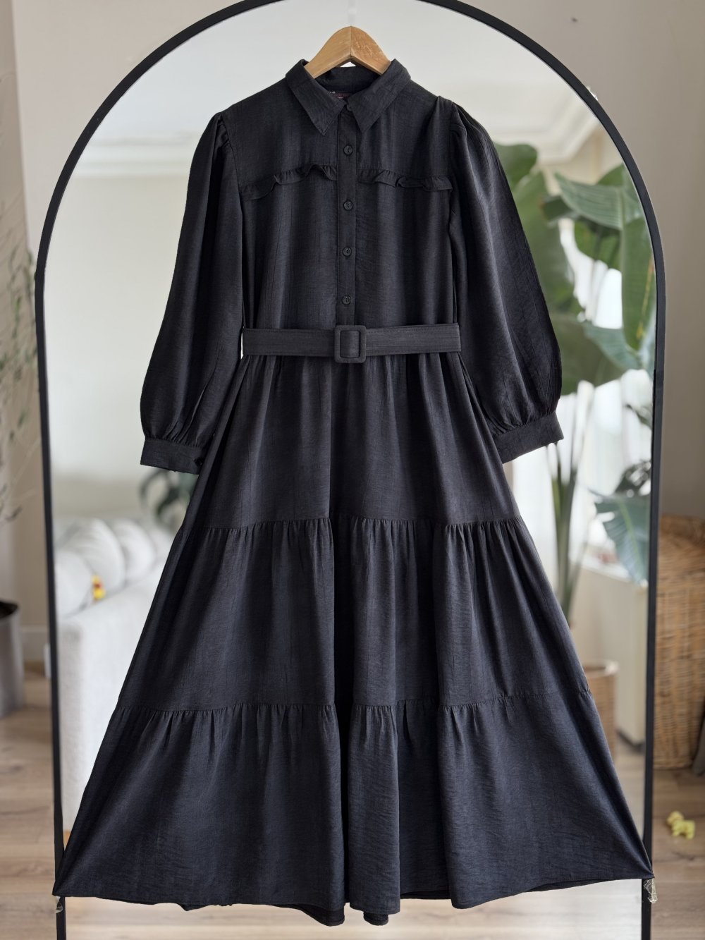 Kemerli fırfır Detaylı elbise Siyah UMS50241