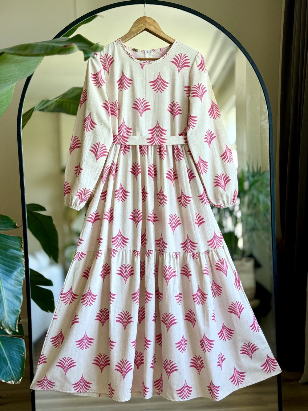 Keten kumaş kuşaklı elbise Fuşya HBS1582
