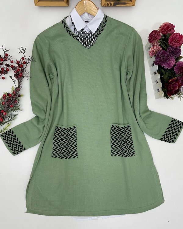 Kol cep kazayağı desen triko Tunik Mint ANT1258