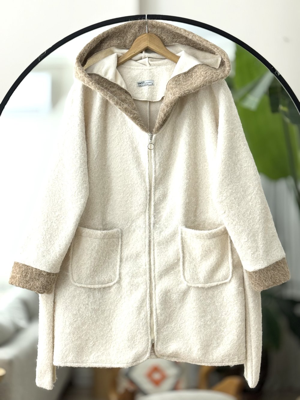 Kol ve kapşon Parcalı fermuarlı uzun kap BejUMS50327