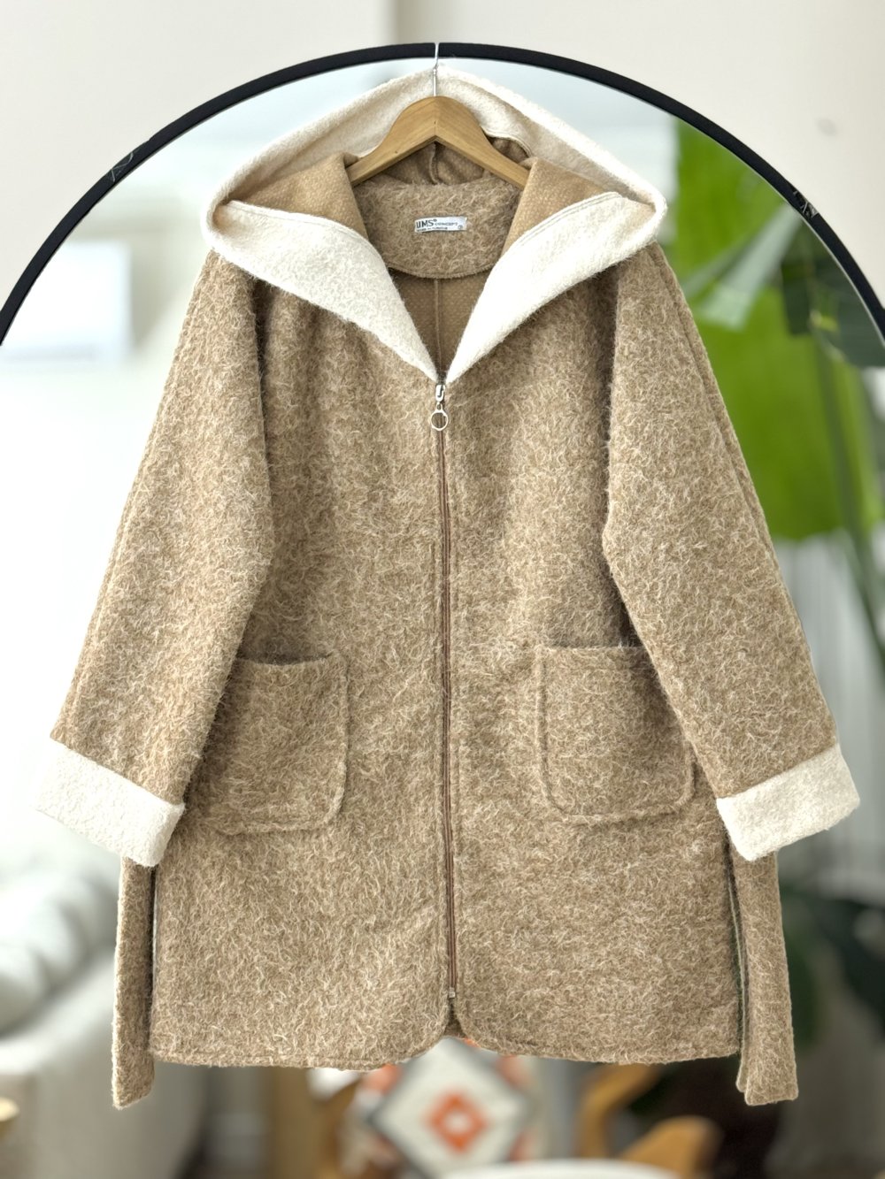 Kol ve kapşon Parcalı fermuarlı uzun kap Camel UMS50327