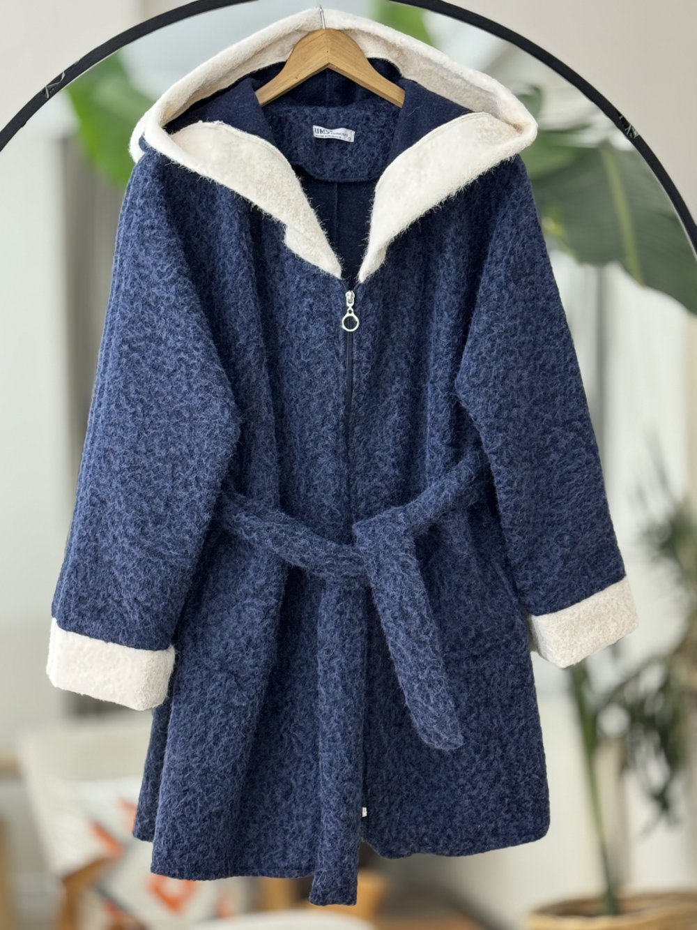 Kol ve kapşon Parcalı fermuarlı uzun kap indigoUMS50327