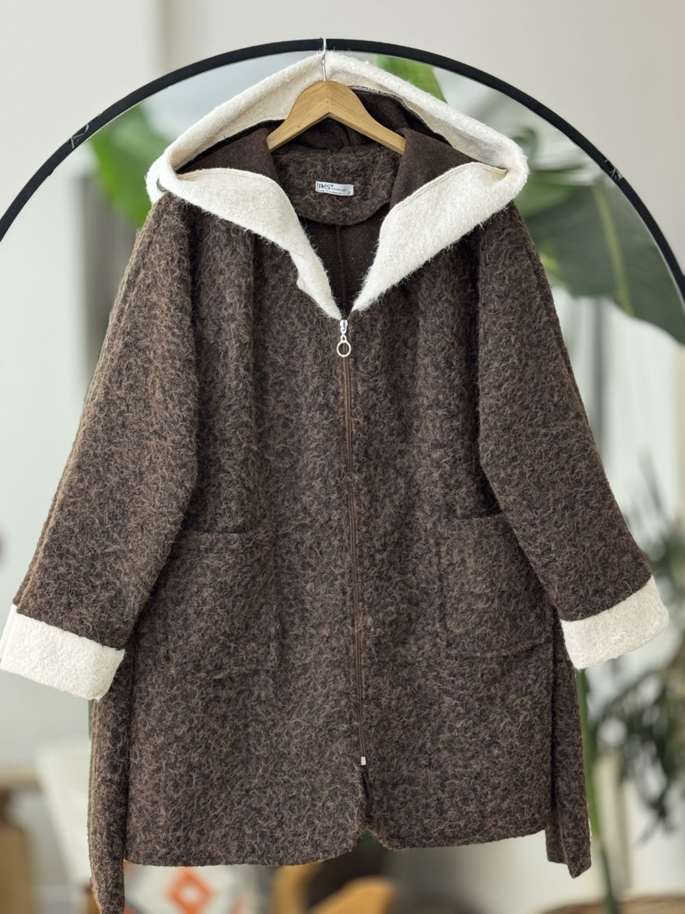 Kol ve kapşon Parcalı fermuarlı uzun kap Kahve UMS50327