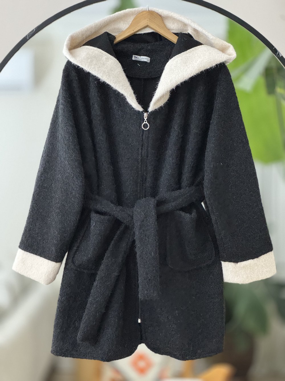 Kol ve kapşon Parcalı fermuarlı uzun kap Siyah UMS50327