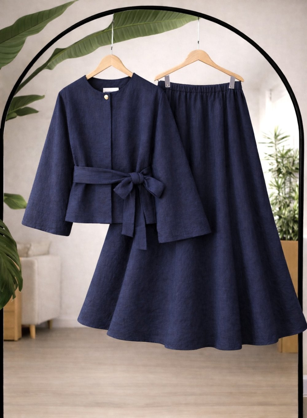 Kuşaklı salaş kol Tek düğmeli etekli Takım Lacivert EF9541