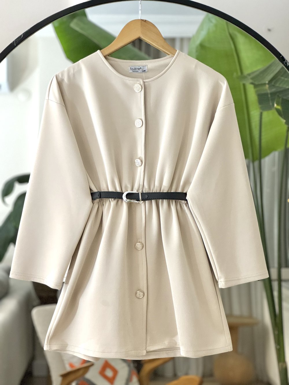 Metal düğmeli kemerli bel lastikli Tunik Bej BK9525