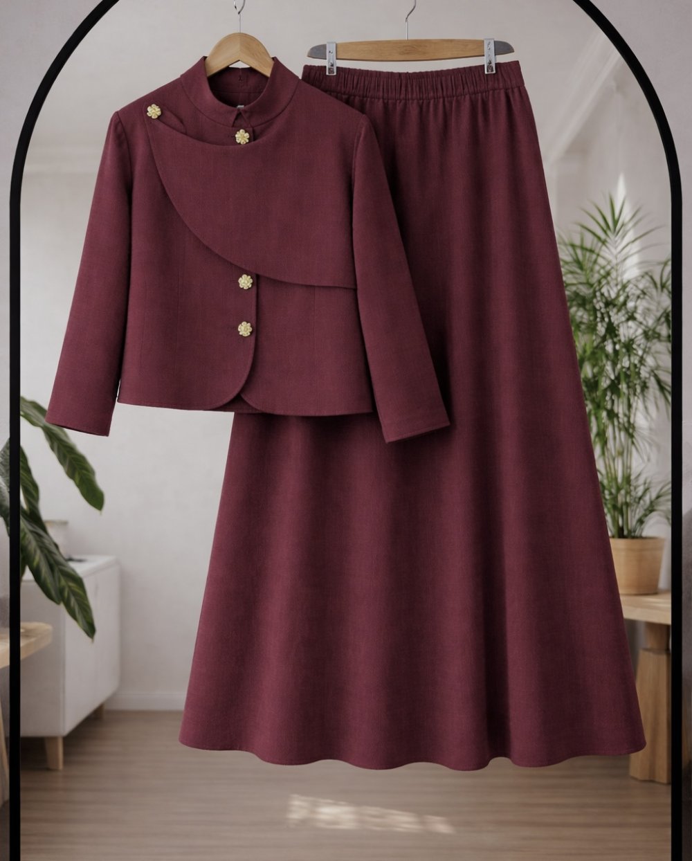 Metal Düğmeli Keten Etekli takım Bordo TCN40171