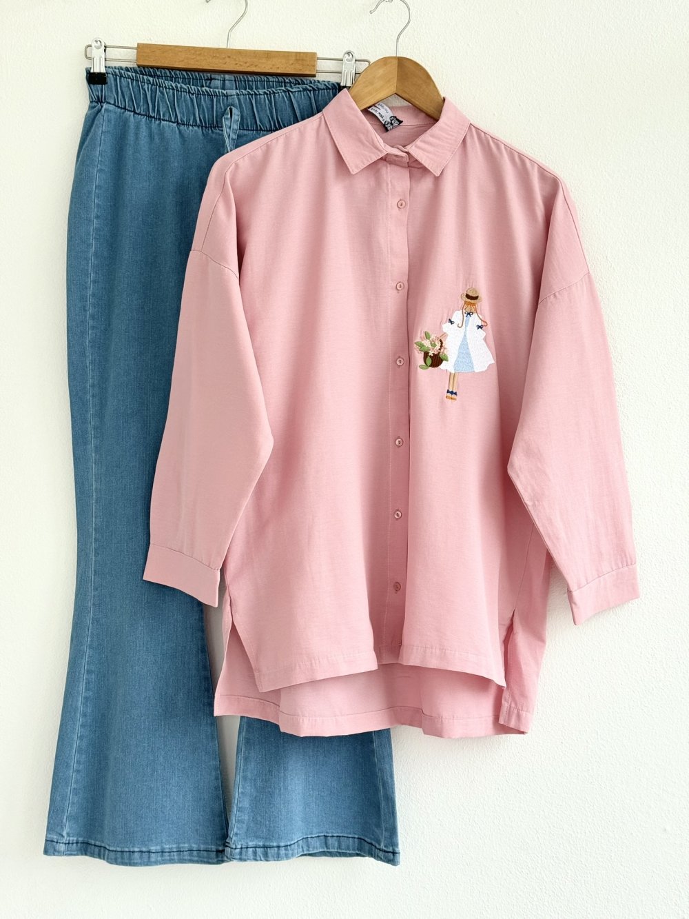 Bu ürün: Nakış işlemeli Poplin Kumaş Tunik pembe SLT 30245