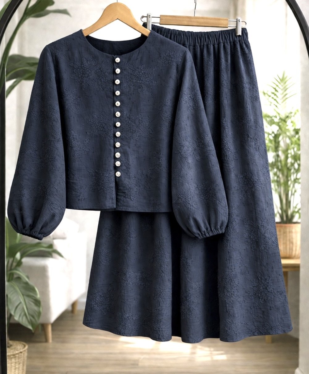 Nakışlı kumaş işleme Etek blüz takım Lacivert UMS60349