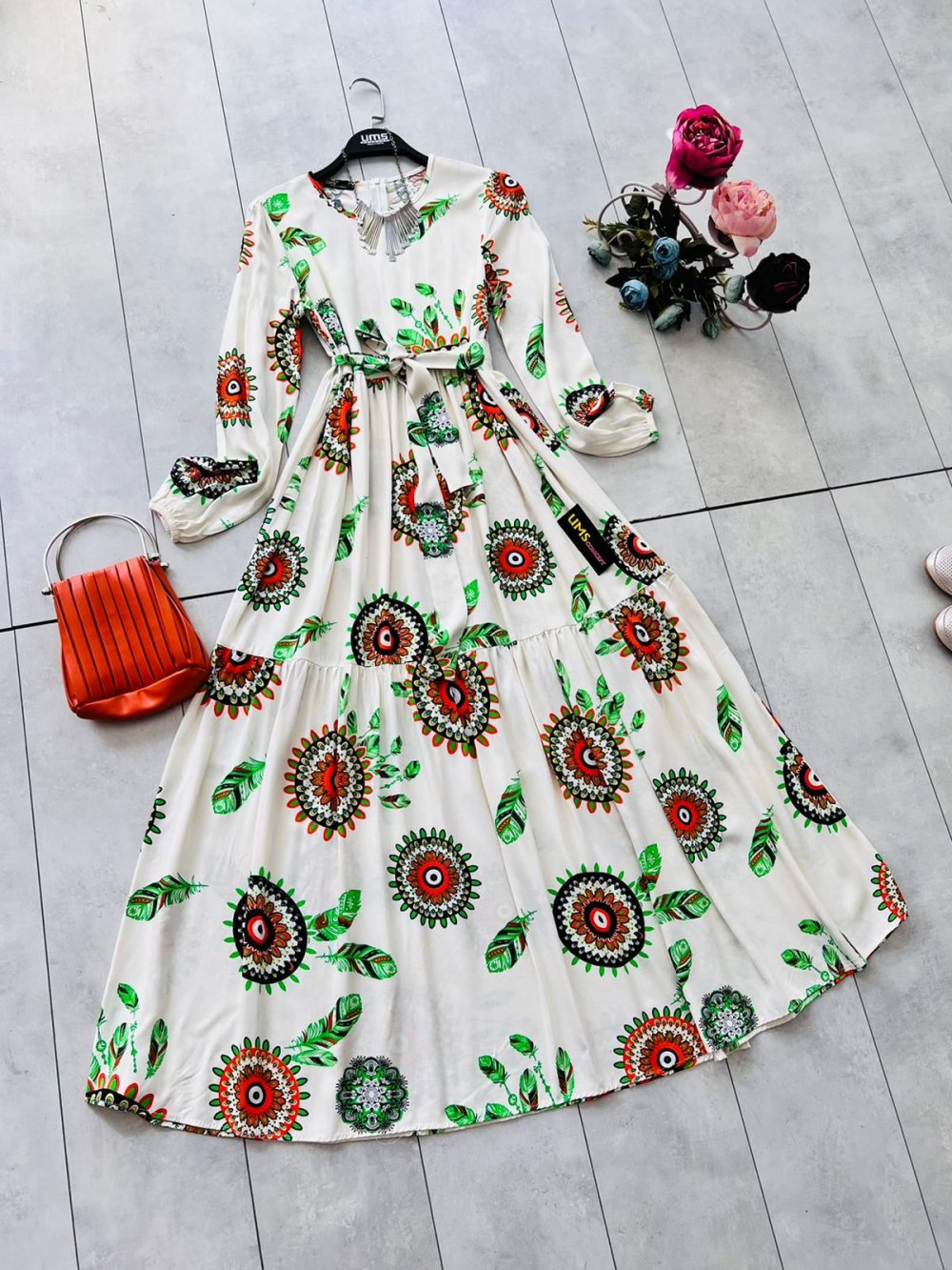 Nazarboncuklu dokuma Viskon elbise ekru UMS1638