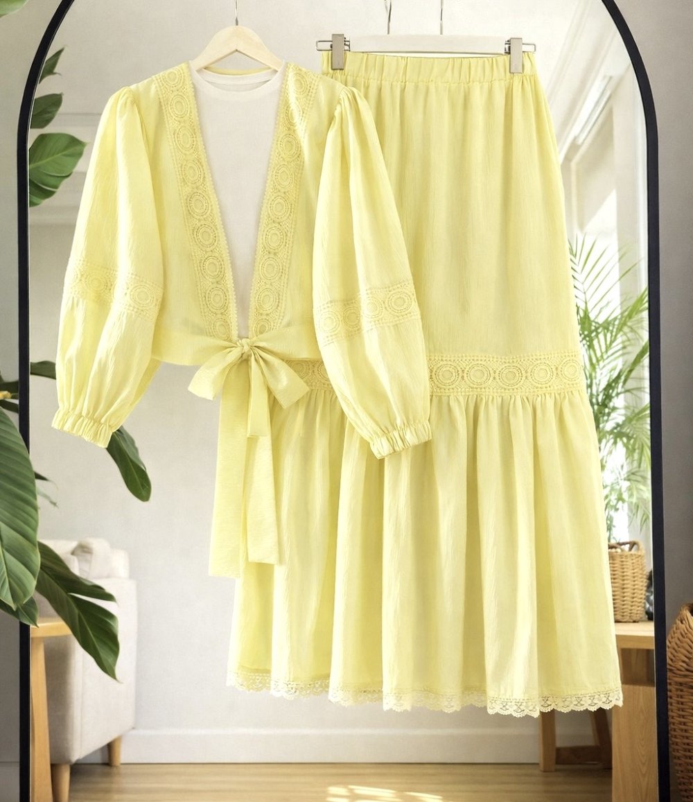 Ön bağlamalı Dantel Gecişli Etekli ikili Takım Sarı TCN40114