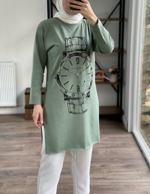 Ön saat baskılı yanları yırtmaçlı penye tunik Mint yeşili