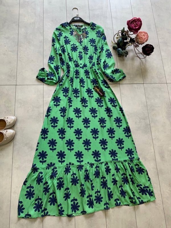 Papatya Desen Viskon Kumaş Elbise Yeşil UMS1128