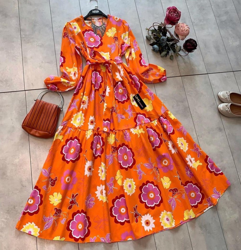 Poplin kumaş fulya desen kiloş elbise turuncu UMS1627