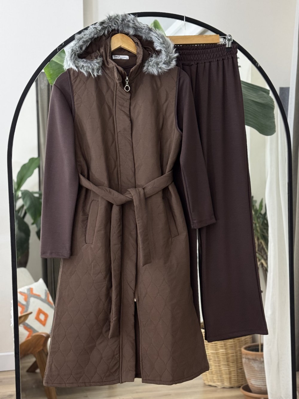 seyyar kapşonlu üçlü Kapitone Takım Kahve UMS50325